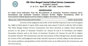 पश्चिम बंगाल विद्यालय सेवा आयोग (WBSSC) ले सरकारी अनुदानित/प्रायोजित माध्यमिक र उच्च माध्यमिक विद्यालयहरूमा कक्षा IX–X (माध्यमिक) र कक्षा XI–XII (उच्च माध्यमिक) का लागि दोस्रो राज्यस्तरीय चयन परीक्षा (SLST), 2025 को लागि आधिकारिक सूचना प्रकाशित गरेको छ।